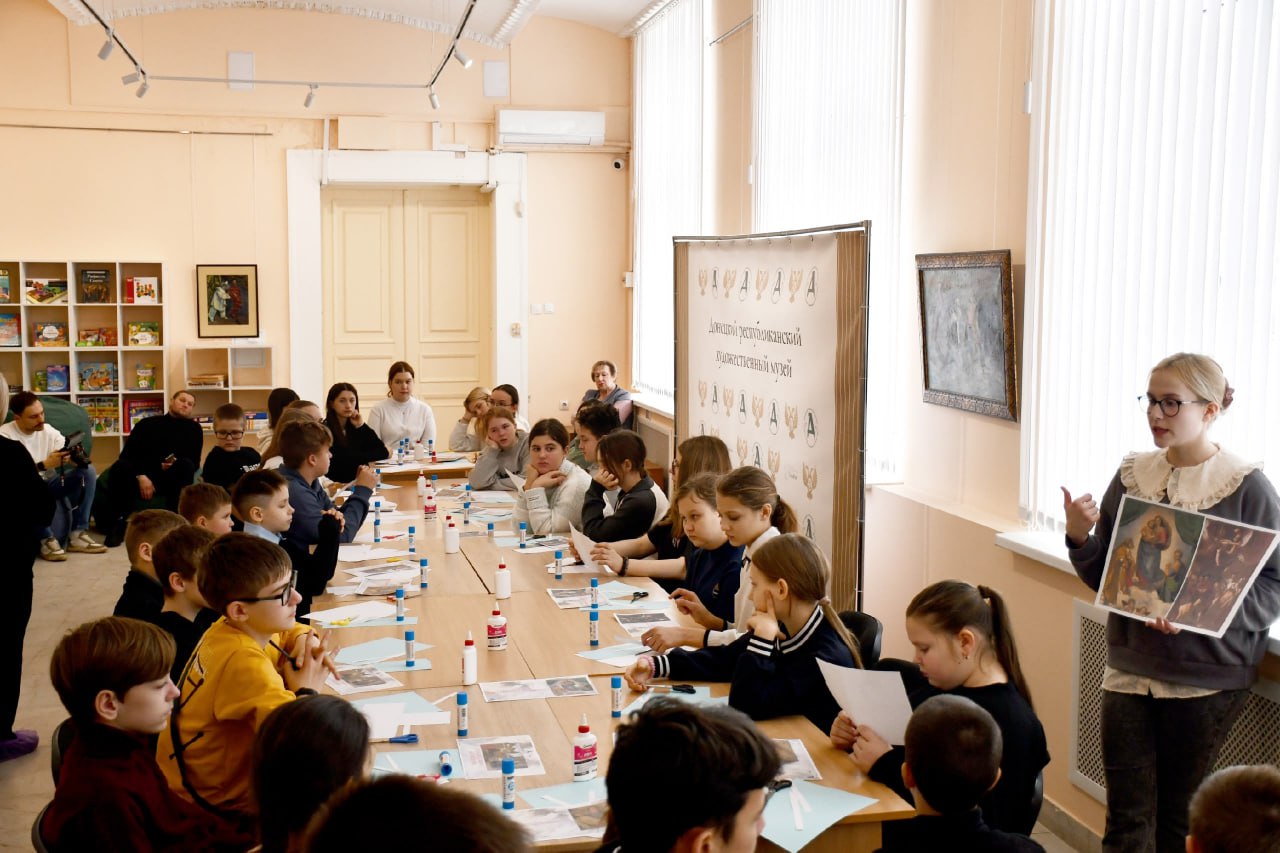 24 декабря, в преддверии новогодних и рождественских праздников, в Донецком республиканском художественном музее состоялось тематическое музейное занятие для учащихся 5-11 классов ГБОУ «Школа № 55 им. А. Г. Коржа г. о. Донецк», объединившее традиции, искусство и детское творчество.