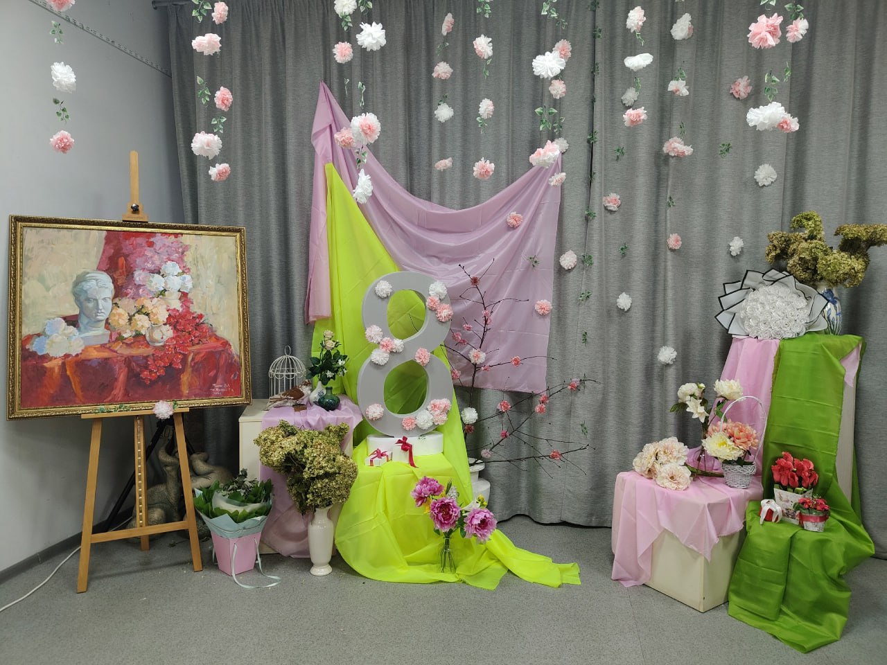 С самого утра 6 марта в колледже царила предпраздничная атмосфера. Ведь будущие художники создали уникальную тематическую фотозону. В центре композиции разместили ветку сакуры ручной работы, а вокруг расположили композиции из цветов, коробки с подарками и живописную картину.