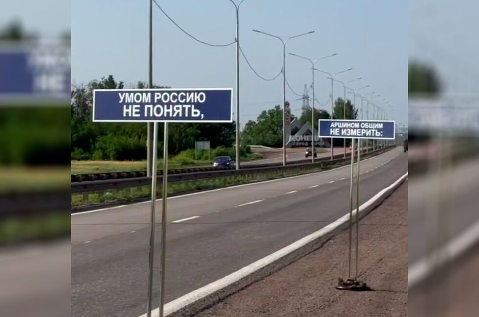 Донецк, 12 июн — ДАН. На въезде в Донецк со стороны Мариуполя разместили таблички, напоминающие дорожные знаки, на которых написаны стихи Федора Тютчева про Россию. Об этом сообщает телеграм-канал «Шорты ДНР». ...