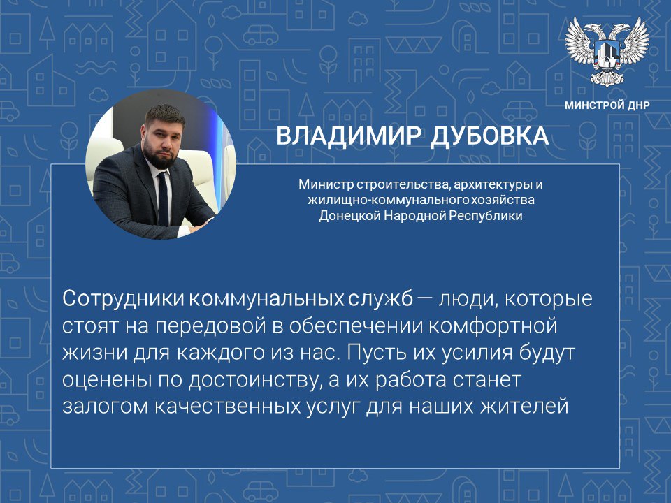 «Мы призываем всех жителей Донецкой Народной Республики выразить свою благодарность работникам жилищно-коммунального хозяйства за их нелегкий труд. Они — те, кто стоит на передовой в обеспечении комфортной жизни для каждого из нас. Пусть их усилия будут оценены по достоинству, а их работа станет залогом качественных услуг для наших жителей», - отметил руководитель Минстроя ДНР Владимир Дубовка.
