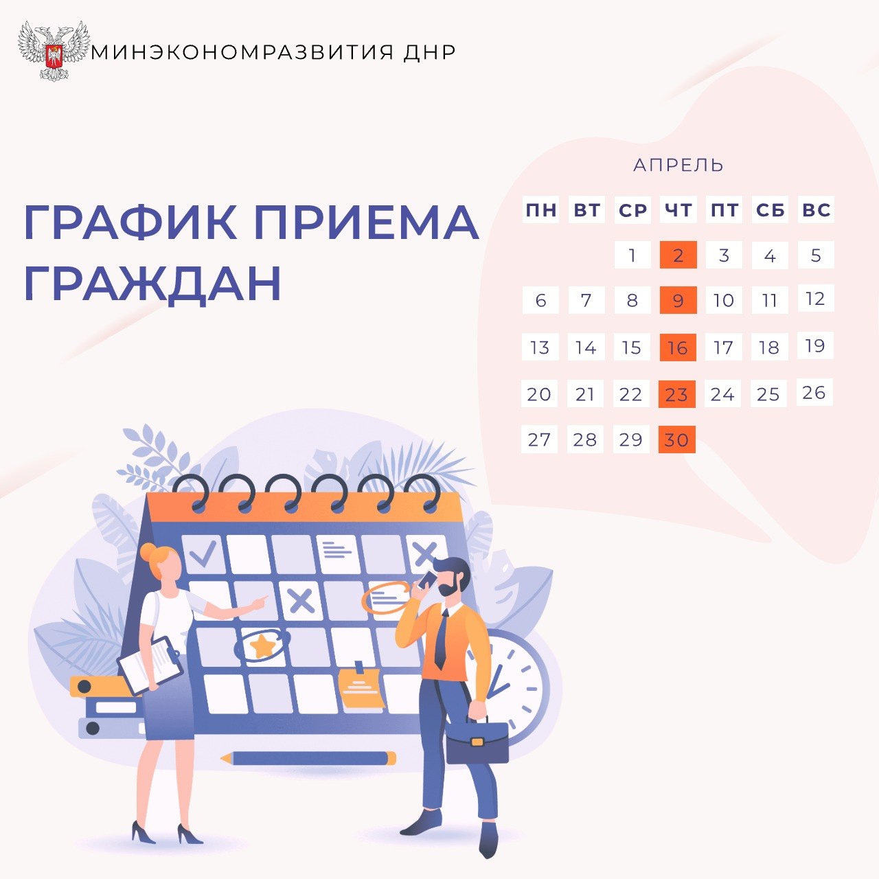 Сообщаем о датах приема граждан руководством Минэкономразвития ДНР в апреле 2026 года: