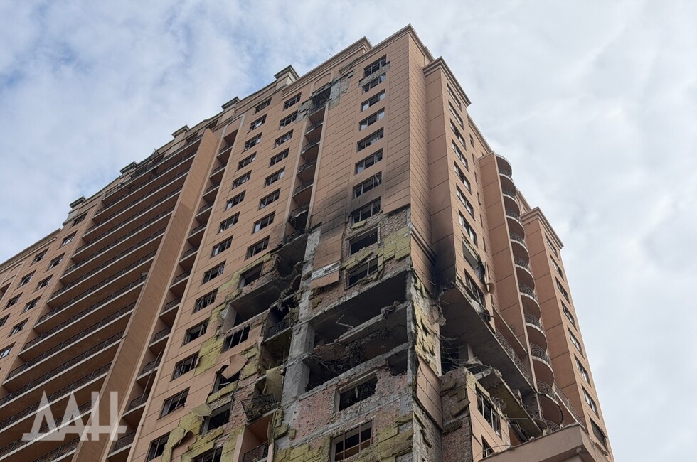 Удар был нанесён сегодня утром. Рядом с поврежденной высоткой сгорел гражданский автомобиль, разбиты и другие машины мирных жителей.