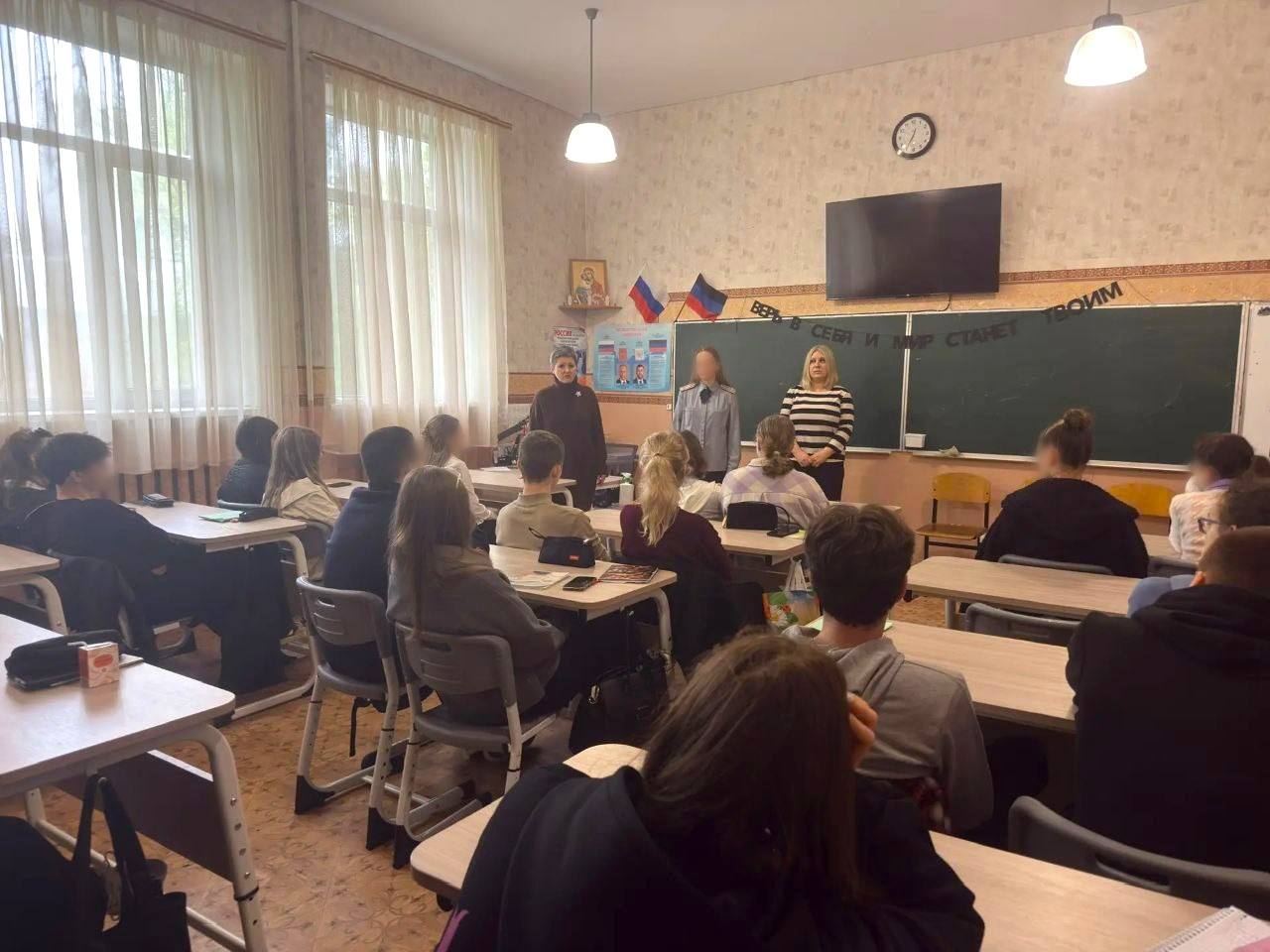 Начальник филиала по Куйбышевскому району г. Донецка УИИ ГУФСИН России по Донецкой Народной Республике приняла участие в проведении профилактического занятия с учащимися 10-11 классов ГБОУ «Школа № 72 г.о. Донецк». В мероприятии также приняли участие заместитель руководителя Управы Куйбышевского внутригородского района Администрации городского округа Донецк, председатель комиссии по делам несовершеннолетних и защите их прав и заведующая сектором по делам молодежи, культуры и спорта Управы Куйбышевского внутригородского района Администрации городского округа Донецк ДНР.