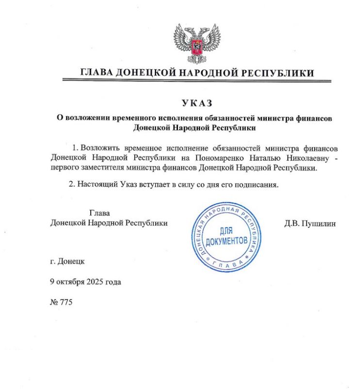 Временно исполняющим обязанности министра финансов Донецкой Народной Республики назначена первый замминистра финансов ДНР Пономаренко Наталья Николаевна. Указ об этом подписал сегодня Глава ДНР.