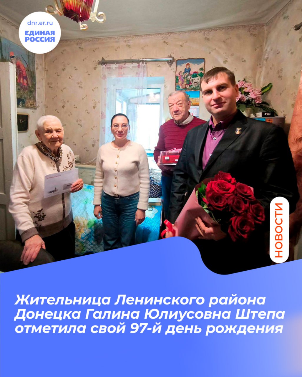 23 января жительница Ленинского района Донецка Галина Юлиусовна Штепа отметила свой 97-й день рождения. Поздравить именинницу с этим значимым событием пришли Кирилл Рыбаков – депутат Донецкого городского совета ДНР от Единой России, руководитель Управы Ленинского внутригородского района Татьяна Темникова и председатель районного Совета ветеранов Константин Просвирин.