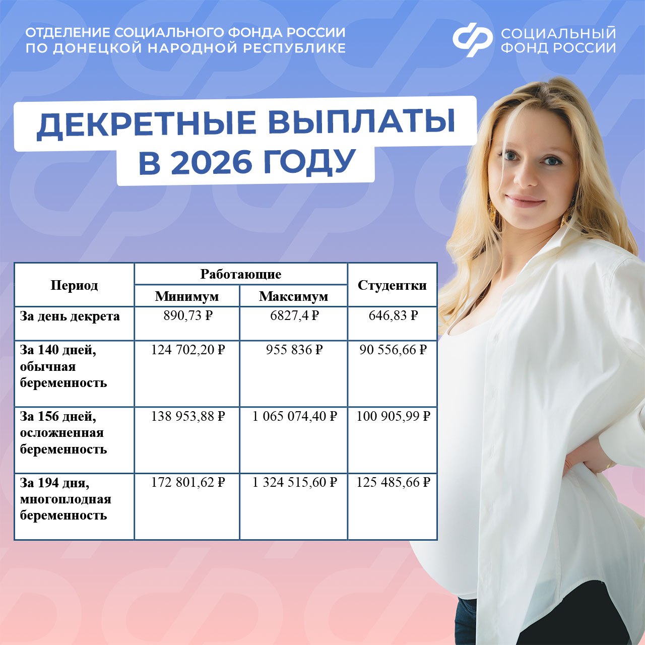Пособие по беременности и родам работающим женщинам, студенткам из Донецкой Народной Республики в 2026 году