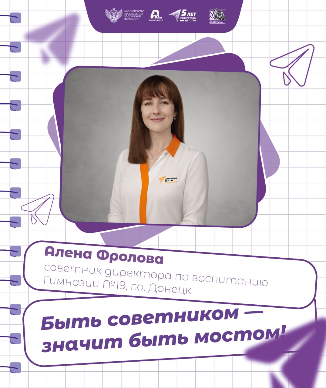 Сегодня в рубрике — Алёна Фролова, советник директора по воспитанию Гимназии № 19 города Донецка. Алёна помогает ребятам находить «своё» дело — от «Орлят России» и «Движения Первых» до школьного медиацентра, театра и военно-патриотического клуба — и поддерживает детские инициативы, из которых рождаются большие дела.