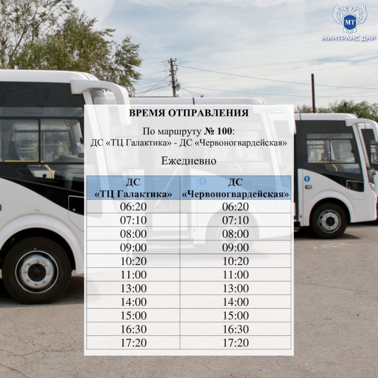 С 6 апреля обслуживание межмуниципального маршрута № 100 Донецк ("ДС "ТЦ Галактика") - Макеевка (ДС "Червоногвардейская") осуществляется государственным предприятием ГУП ДНР "ДОНБАССКАЯ ТРАНСПОРТНАЯ КОМПАНИЯ".