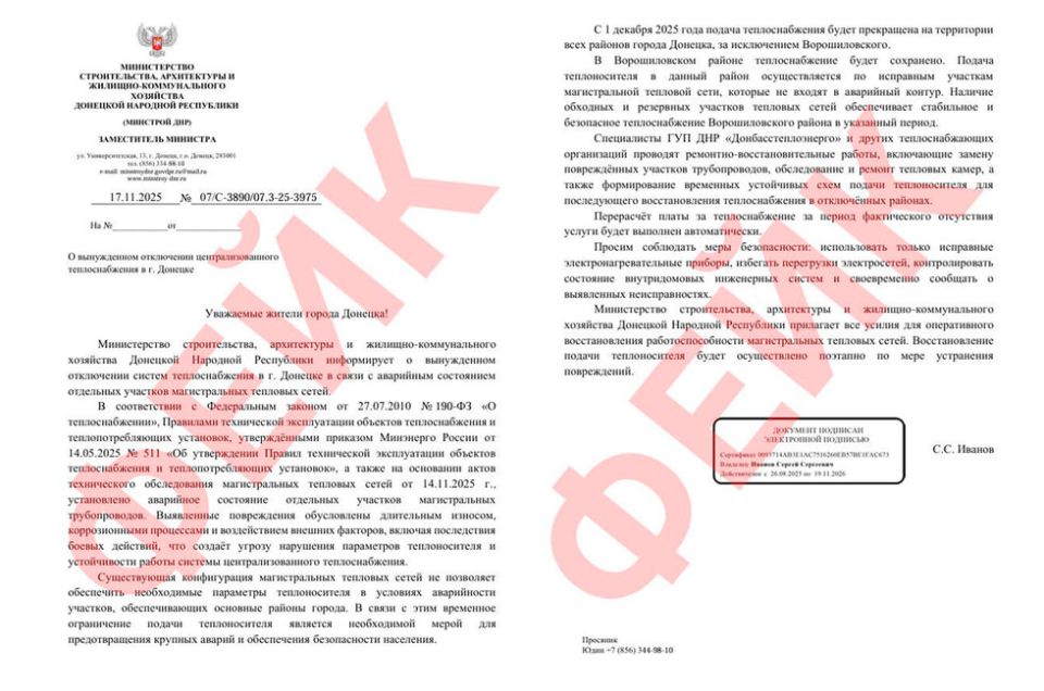 Донецк, 21 ноя — ДАН. Отключения системы теплоснабжения в Донецке не будет. Об этом ДАН сообщили в пресс-службе Министерства строительства и жилищно-коммунального хозяйства ДНР. Отметим, что в социальных сетях появился документ якобы...