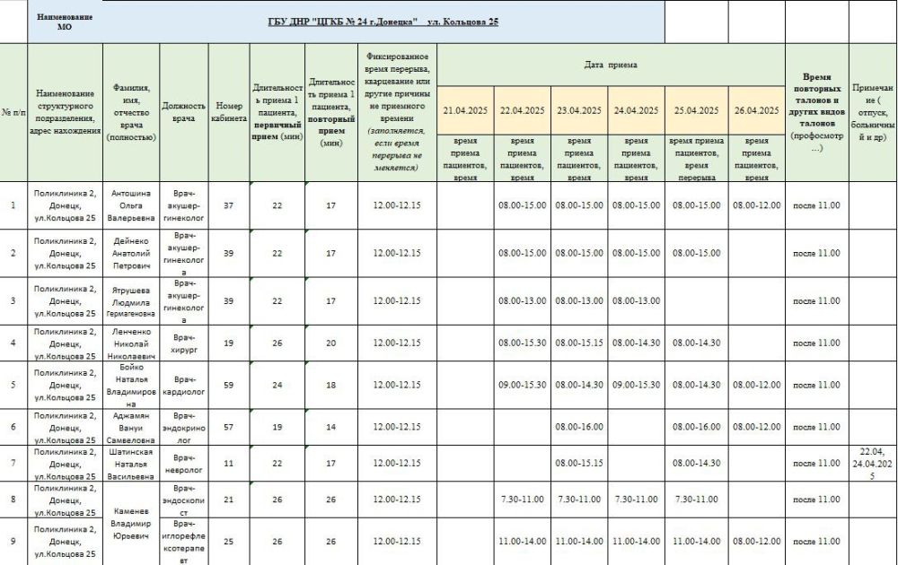 Актуальный график приёма специалистов ГБУ ДНР "ЦГКБ № 24 г.Донецка" с 22.04 по 26.04.2025 г.
