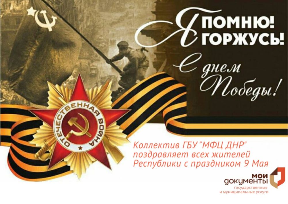 Коллектив ГБУ "МФЦ ДНР" сердечно поздравляет жителей Донецкой Народной Республики с 9 Мая - Днем Победы!