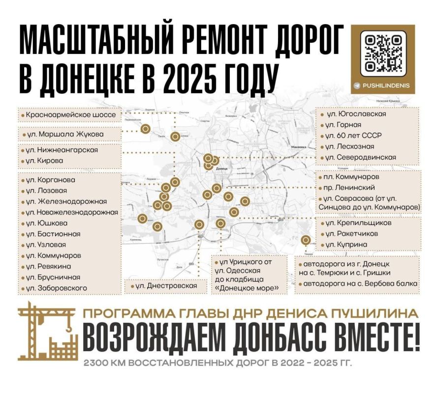 «Шаг за шагом восстанавливаем транспортный каркас Донбасса. С 2022 года уже отремонтировали свыше 1500 километров дорог. В этом году привлекли дополнительные средства, и, вместо 450 запланированных ранее, сделаем более 800 километров. Этот показатель — один из самых высоких в России с учетом оперативной обстановки», — отметил Денис Пушилин.