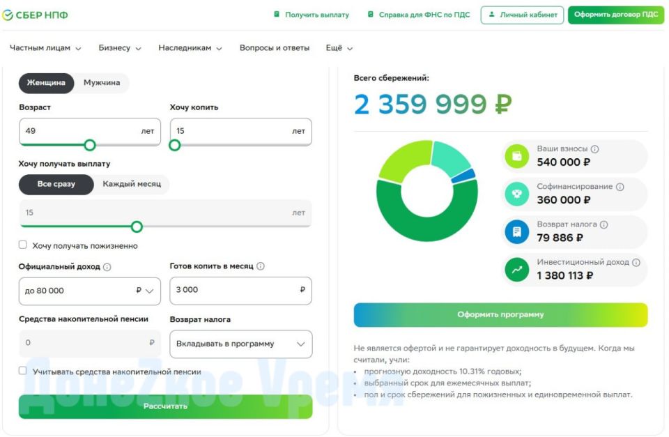 Калькулятор Сбер НПФ подготовил по нашему запросу расчет с прогнозной доходностью 10,31% годовых.