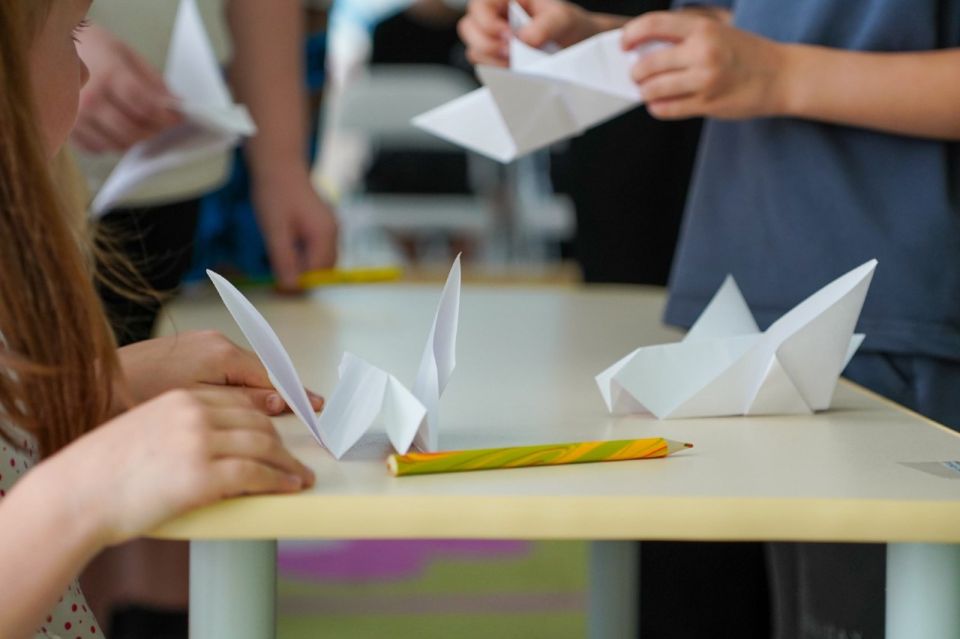 В память о погибших детях Донбасса в Пролетарском районе состоялся мастер-класс по изготовлению бумажных журавлей. Воспитанники детского сада № 328 скрупулезно, ответственно и старательно повторяли каждое движение ведущего мастер-класса, а достигнуть успеха и желаемого результата в этом важном деле им помогали старшие товарищи – учащиеся лицея № 124.