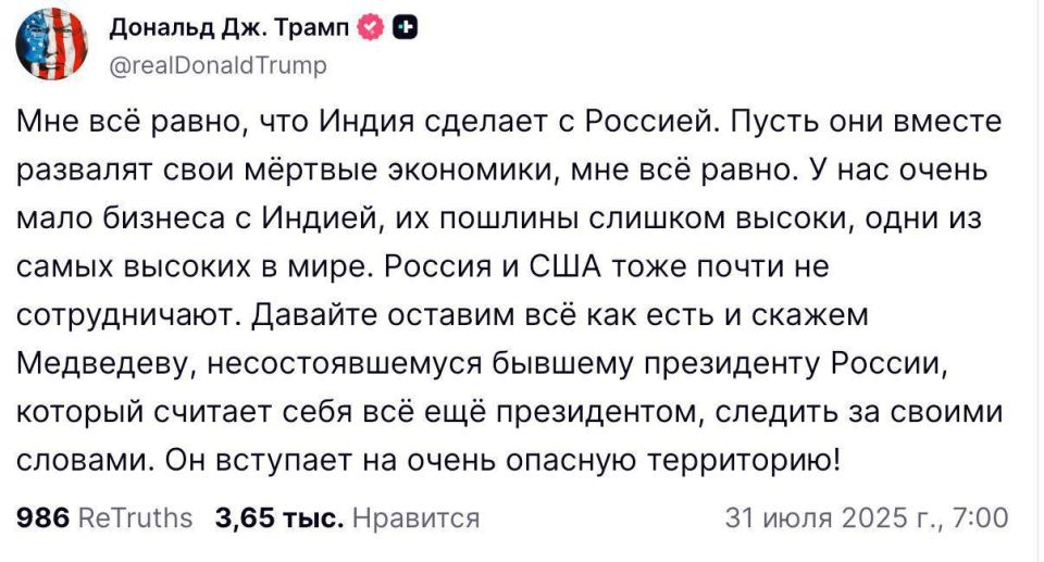Против индусов он пообещал ввести пошлины в 25%. Сказал, мол, Индия Штатам друг, но слишком много покупает у России! Страна вообще проигнорировала этот факт, за что Трамп взорвался в соцсетях каким-то ну очень безумным твитом, он на картинке. Еще только не проклял.