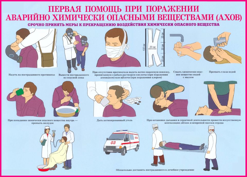 Просим Вас ознакомиться с листовками «Первая помощь при поражении аварийно химически опасными веществами (АХОВ)», «Действия при аварии с выбросом аммиака», «Действия при аварии с выбросом хлора».