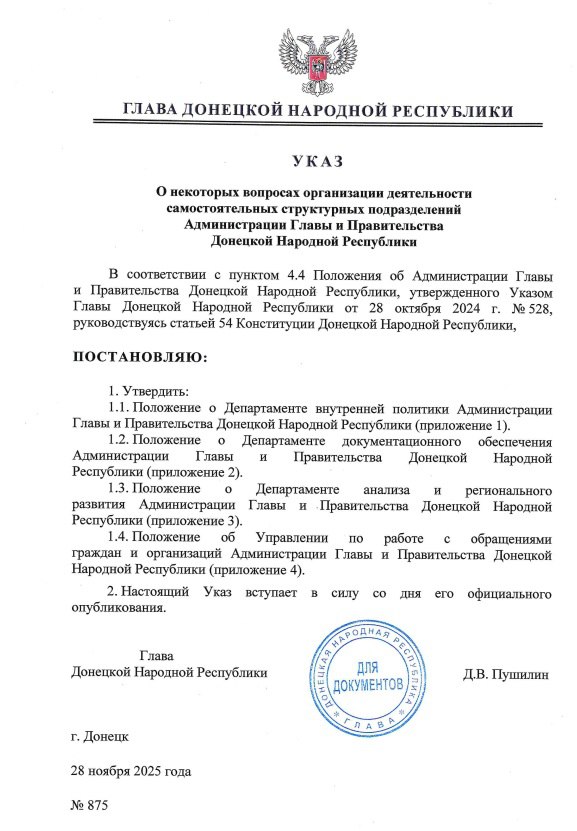 Указом Главы ДНР № 875 от 28 ноября 2025 года урегулированы некоторые вопросы организации деятельности самостоятельных структурных подразделений Администрации Главы и Правительства Донецкой Народной Республики.