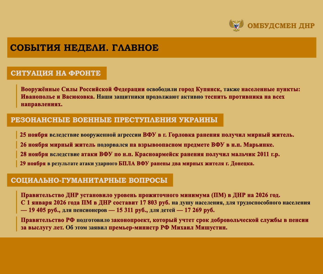 Дарья Морозова: ОБЗОР СОЦИАЛЬНО-ГУМАНИТАРНОЙ СИТУАЦИИ, СЛОЖИВШЕЙСЯ НА ТЕРРИТОРИИ ДОНЕЦКОЙ НАРОДНОЙ РЕСПУБЛИКИ ВСЛЕДСТВИЕ ВОЕННЫХ ДЕЙСТВИЙ В ПЕРИОД С 24 НОЯБРЯ ПО 1 ДЕКАБРЯ 2025 г