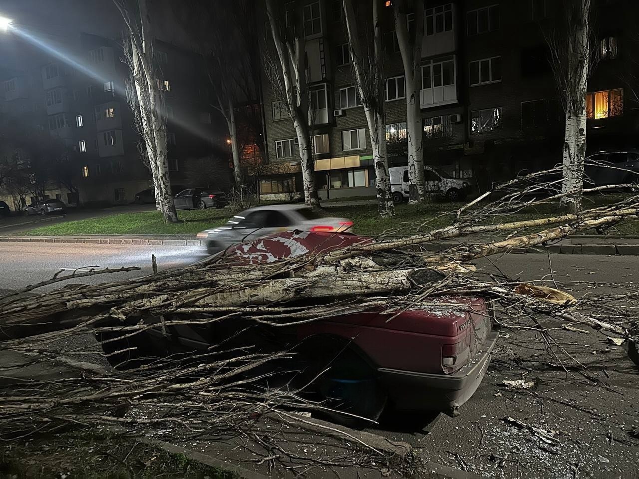 Дерево расплющило автомобиль улице Челюскинцев в Донецке