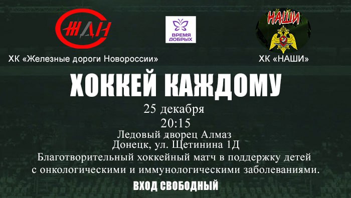Матч между командами ХК «Железные дороги Новороссии» и ХК «Наши» организован совместно с благотворительным фондом «Время добрых» и пройдет в поддержку детей с онкологическими и иммунологическими заболеваниями. Игра состоится в ледовом дворце «Алмаз» в Донецке 25 декабря. Начало в 20.15. Вход свободный.
