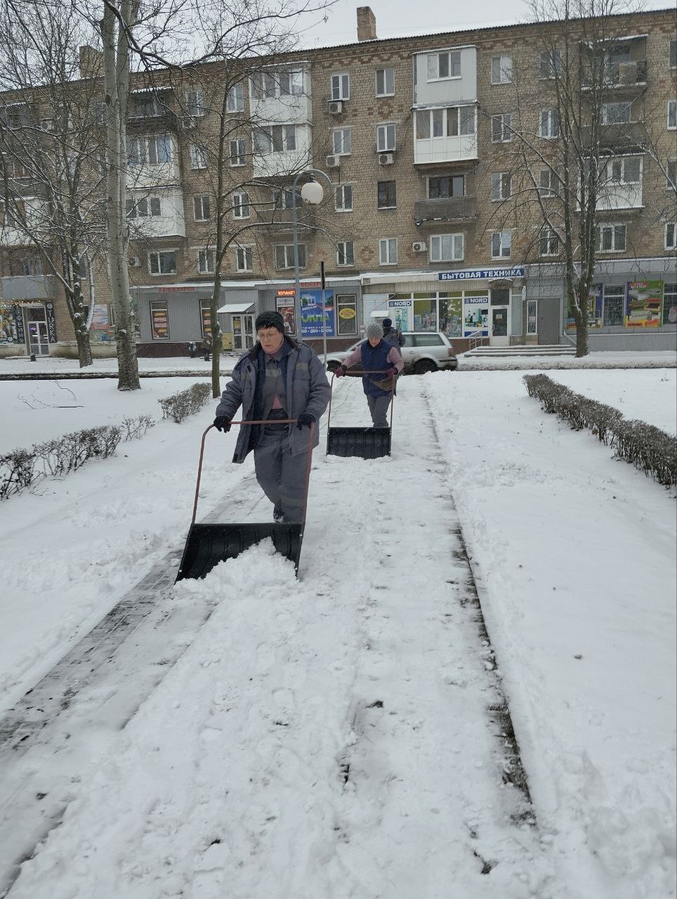 Наталья Бегуненко: Сотрудники Петровского участка МУП АГОД «Зеленое строительство г. Донецк» выполняют работы по уборке снега на площади Победы и спилу сухих деревьев на улице Углегорской