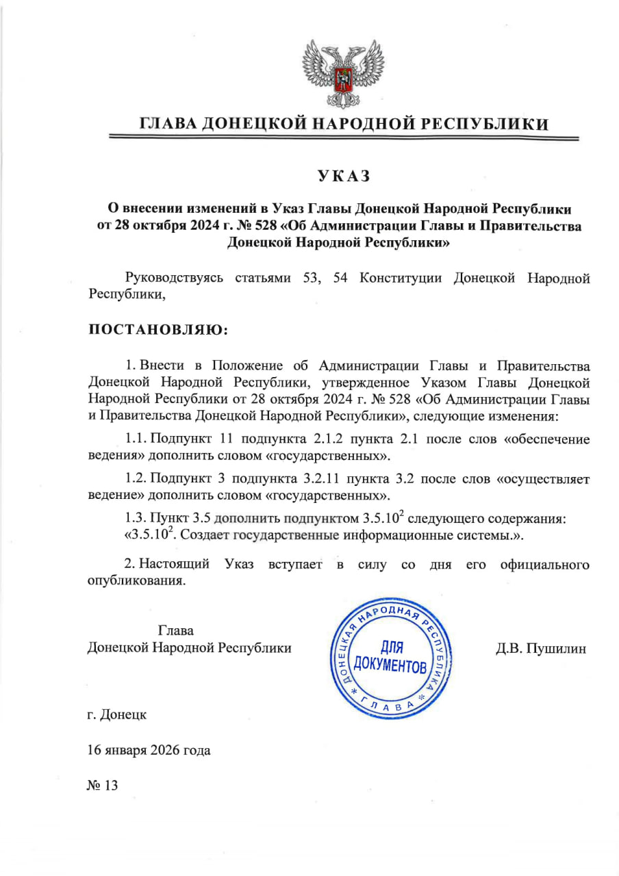 Указом Главы ДНР № 13 от 16 января 2026 г. внесены изменения в Указ Главы Донецкой Народной Республики от 28 октября 2024 года № 528 «Об Администрации Главы и Правительства Донецкой Народной Республики».