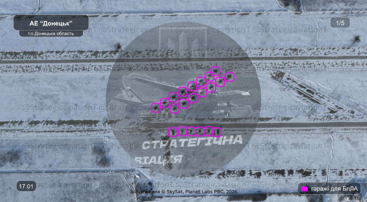 На снимках запечатлено семь стационарных пусковых установок и 93 гаража для хранения дронов.