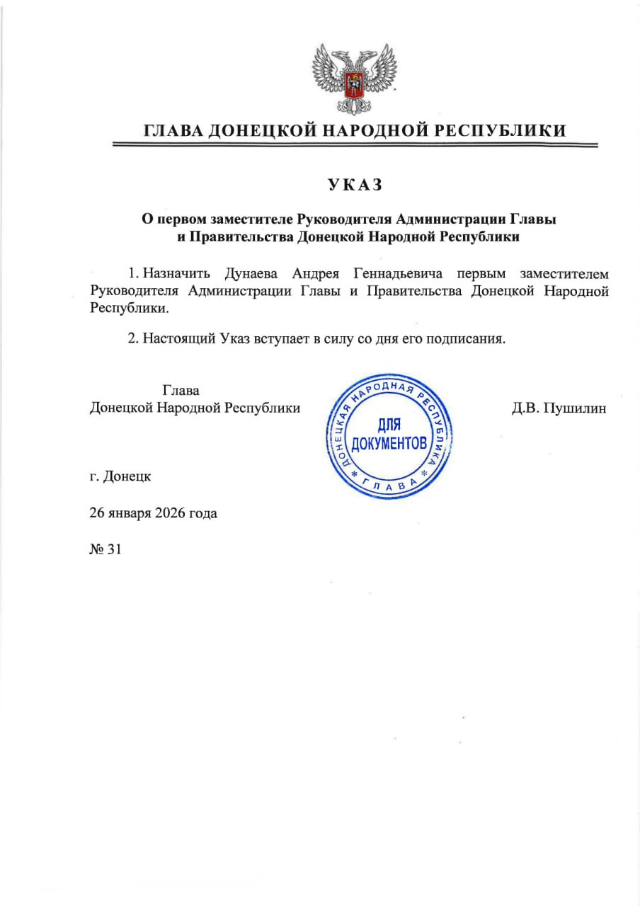 Глава ДНР назначил Дунаева Андрея Геннадьевича первым заместителем руководителя Администрации Главы и Правительства Донецкой Народной Республики. Соответствующий указ подписан сегодня.
