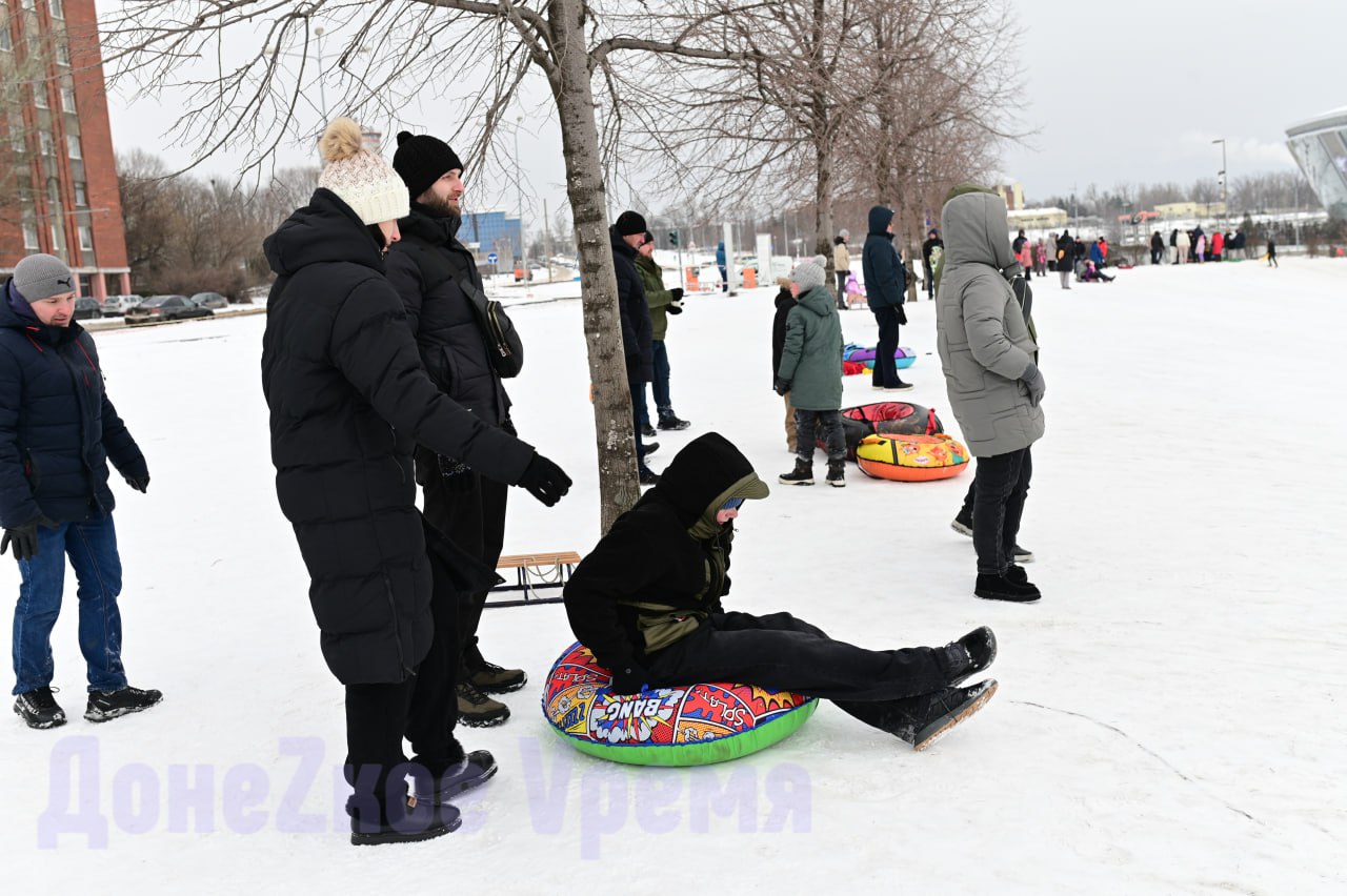Нынешняя зима радует и детей, и взрослых. Вот уже которые выходные в сквере возле “Донбасс Арены” многолюдно. Дончане приходят сюда семьями, чтобы покататься с горки на “ватрушках”.