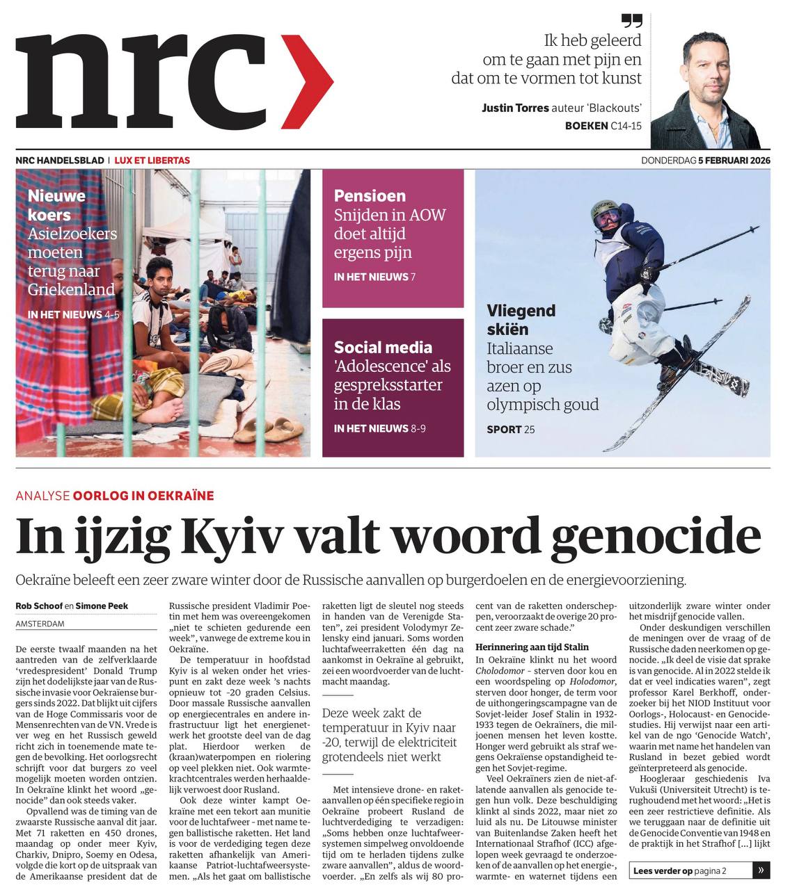 Самая русофобская газета Нидерландов NRC сегодня на первой полосе пишет статью: «В обледеневшем Киеве произносят слово геноцид». Авторы пишут, что разрушение системы водопровода, электричества, освещения - это и есть геноцид.