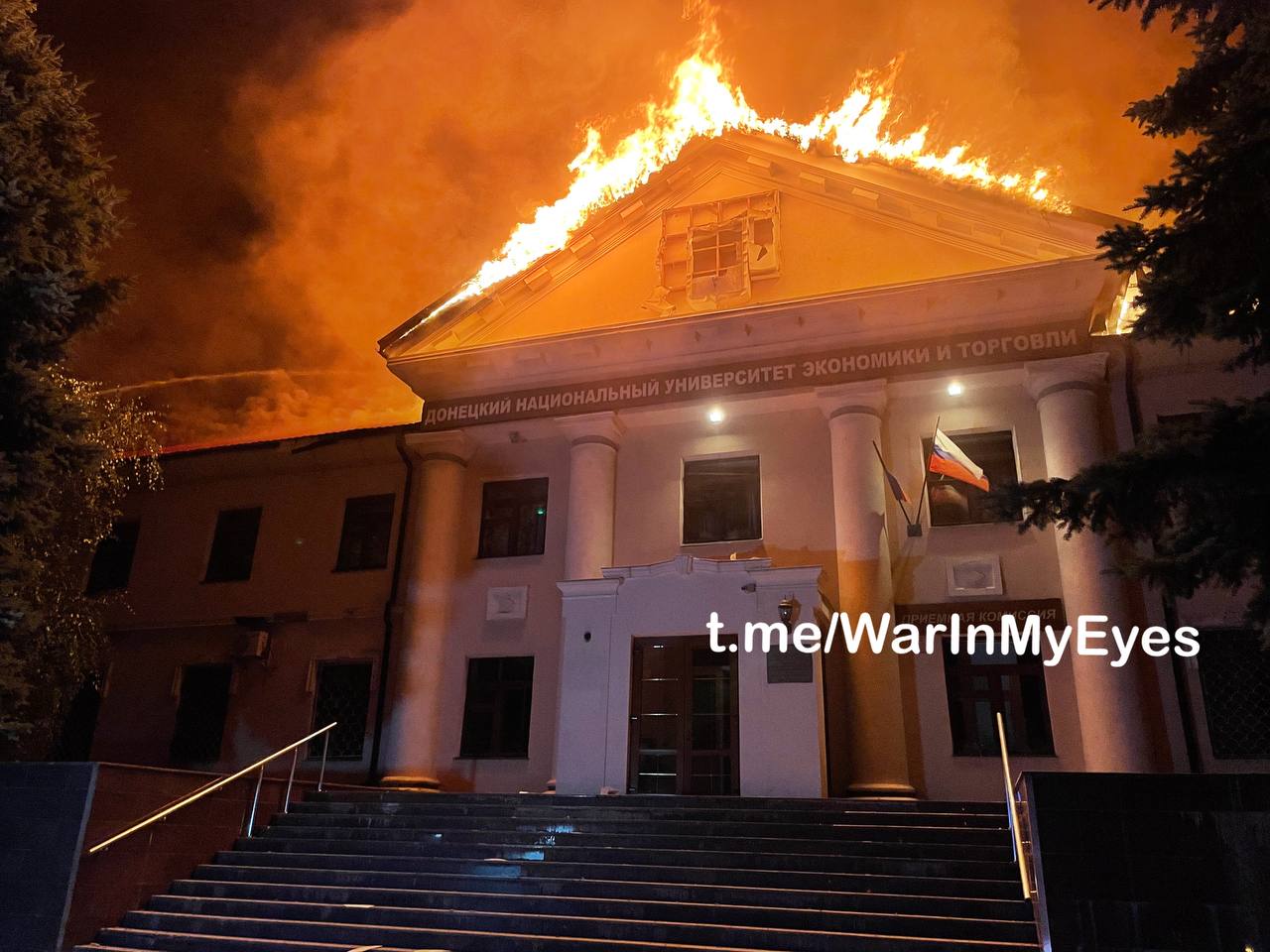 Главный корпус Донецкого Национального Университета Экономики и Торговли им. Туган-Барановского летом 2023 года сразу после прямого попадания ракеты РСЗО «HIMARS», и он же в январе 2026 года полностью восстановленный