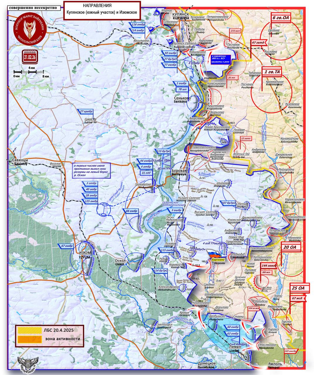 ВС РФ продолжают углублять и расширять по фронту южное основание Боровского выступа. Вышли на правый берег реки Нитриус и Карповского водохранилища, освободили н.п. Карповка (49°1030 с. ш. 37°4334 в. д. - население 396 чел. в 2001 г.) и взяли под контроль переправы через реку. В настоящее время создан плацдарм для размещения сил и средств для наступления направлением Коровий Яр-Рубцы.