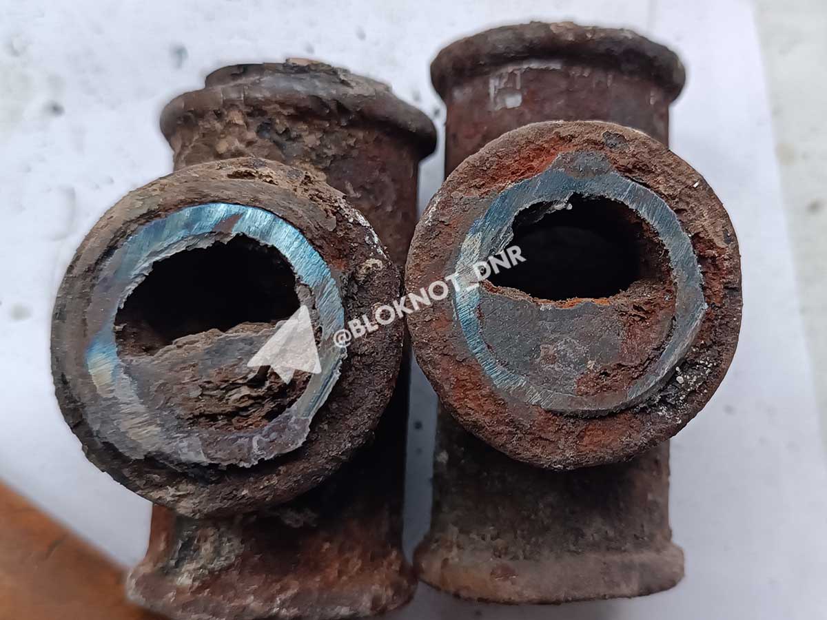 Вот так выглядят старые трубы, подводящие воду к квартирам. Проходного пространства меньше, чем на мизинец.