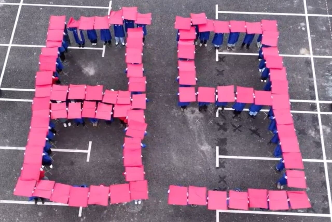 Активисты «Молодой Гвардии», держа в руках красные полотна, выстроились в большую цифру 89.