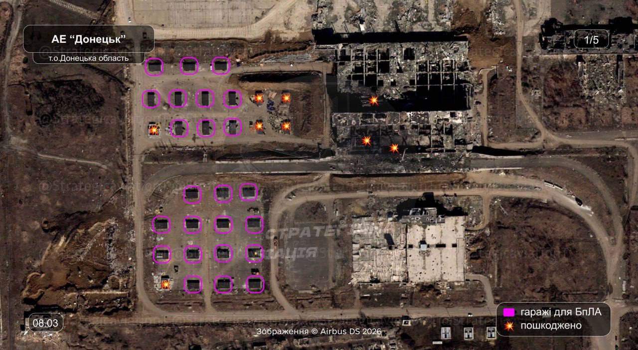 Спутниковая группа «уважаемых партнеров» демонстрирует результат атаки ВСУ американскими ракетами по ангарам возле терминала Донецкого аэропорта.