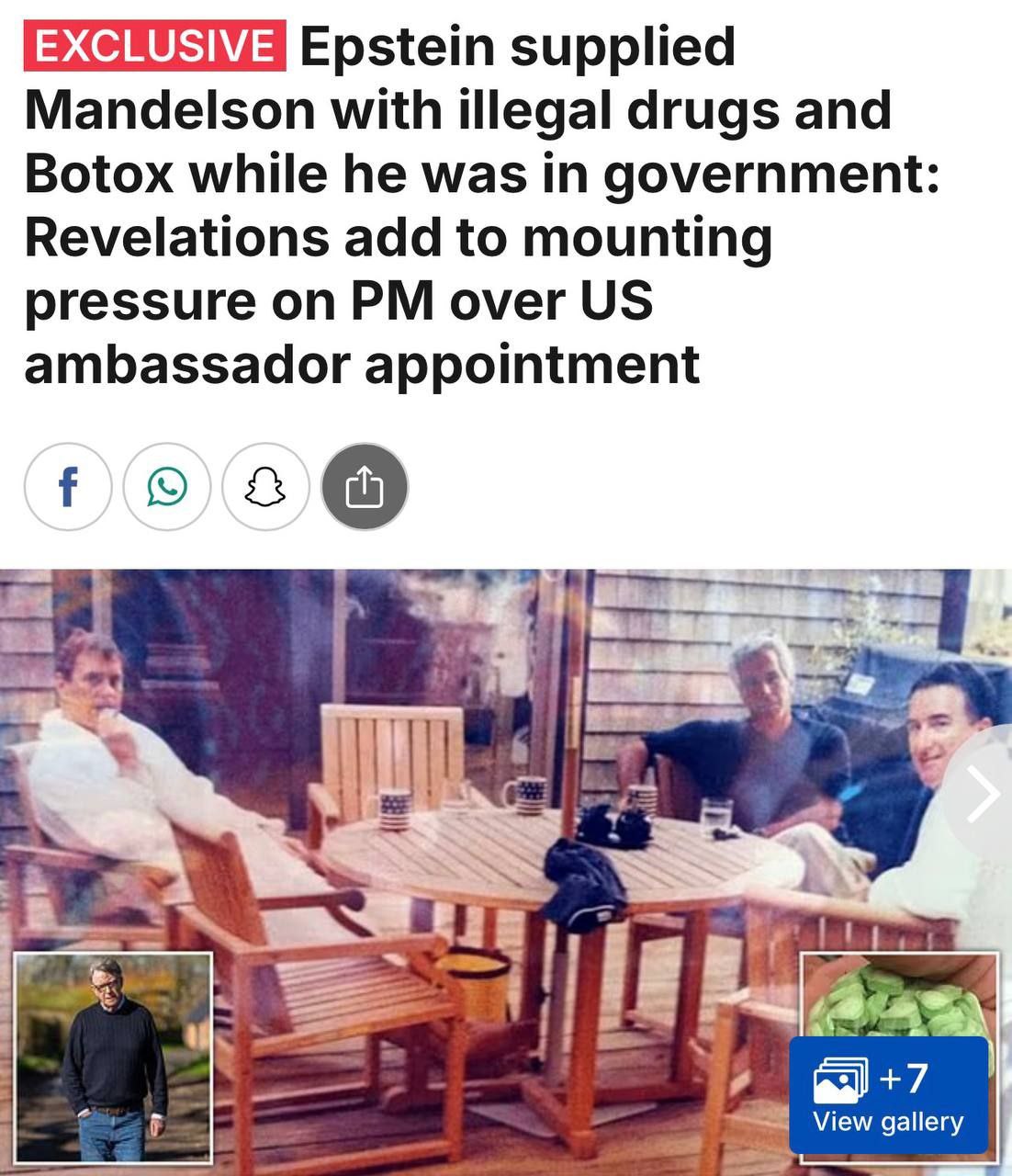 Эпштейн снабжал попавшего в скандал Мандельсона психотропами во время его работы в правительстве — Daily Mail. В переписках с финансистом экс-посол Великобритании в США говорил: препараты (предположительно, «Ксанакс») — «это, конечно, хорошо, но нужен кто-то, на ком их можно использовать». Газета напомнила, что Эпштейн подсаживал жертв на «Ксанакс», чтобы сделать их зависимыми и послушными. Мандельсон, когда ещё находился на своём посту, неоднократно обращался к Эпштейну за лекарствами и «медицинскими консультациями». Тот организовывал для него уколы ботокса в Нью-Йорке, а также советовал принимать некоторые рецептурные препараты.