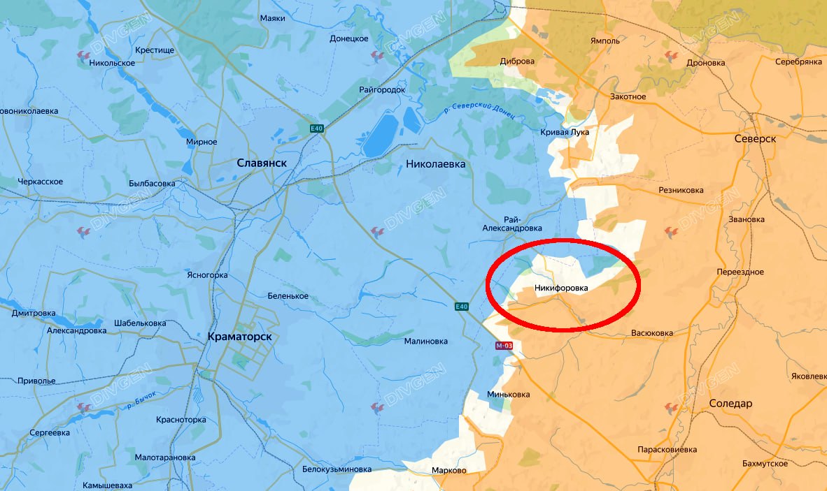 Никифоровка — село в Бахмутском районе бывшей Донецкой области с довоенным населением около 640 человек. Расположено в 3 километрах к востоку от Фёдоровки Второй, об освобождении которой Минобороны сообщило 19 марта. До Краматорска отсюда — порядка 20 километров по прямой. В 5 километрах к северо-западу от Никифоровки — крупное село Рай-Александровка, занимающее положение на важном перекрёстке. Его потеря нарушит логистику ВСУ на этом участке фронта.