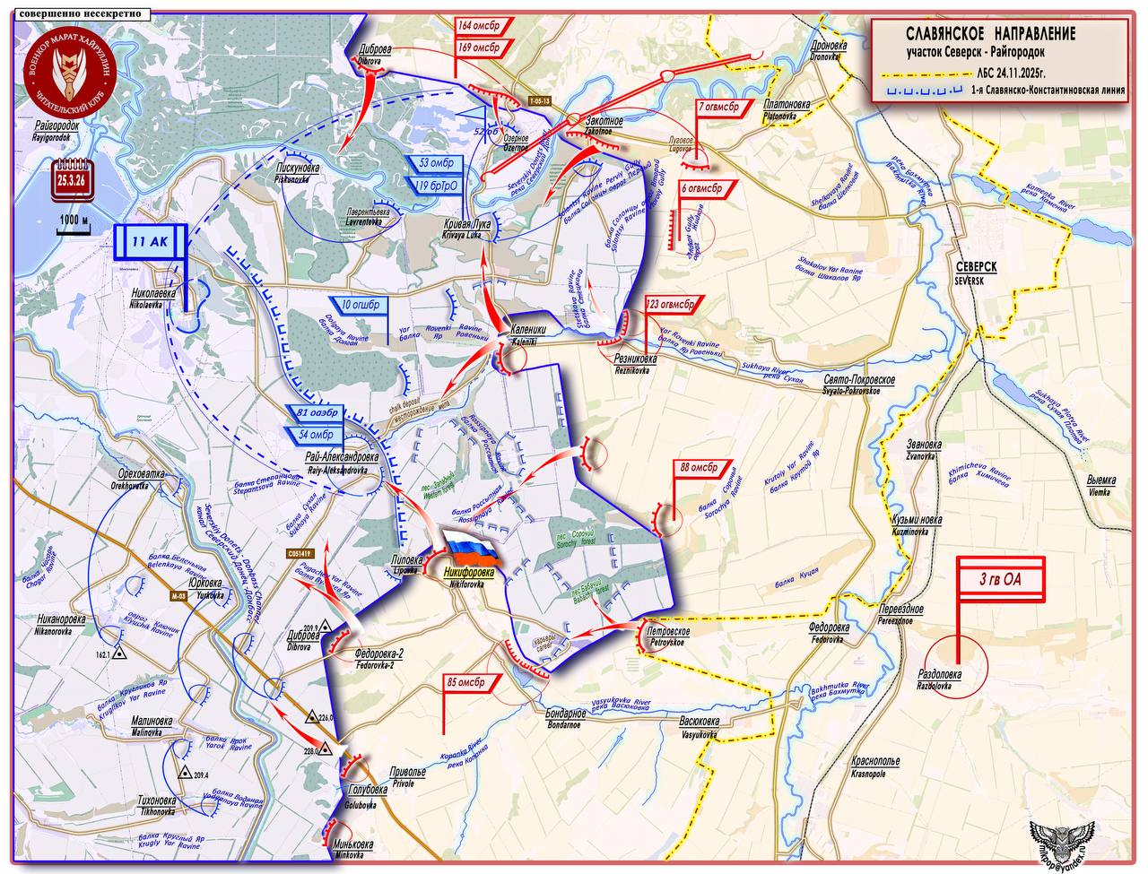 Обратите внимание на желтые пунктирные линии - это контуры ЛБС от 10.10.2025 г. и от 24.11.2025 г. . Наглядная демонстрация того, как «полтора года топтавшееся на месте» Северское направление делает рывок и уходит далеко на запад. Всему свое время в соответствии с замыслом Генштаба.
