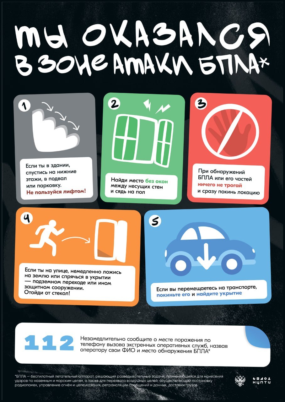 Департамент гражданской защиты администрации городского округа Донецк напоминает о правилах поведения при угрозе атаки БПЛА.