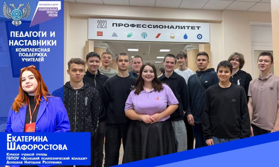 Сегодня представляю куратора учебной группы Донецкого политехнического колледжа Екатерину Евгеньевну Шафоростову, которая успешно совмещает кураторство с работой советника по воспитанию и взаимодействию с детскими общественными объединениями. В колледже она руководит волонтерским отрядом чемпионатного движения «Профессионалы» и командой амбассадоров «Профессионалитета», поддерживая студентов в их стремлении к высоким профессиональным достижениям.