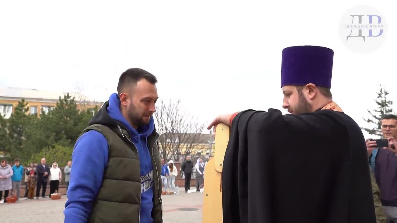 Святыню из Москвы в Донецк доставили руководитель “Молодой Гвардии” и “Молодой Гвардии Единой России” в ДНР Сергей Добровольский и командир интернациональной бригады “Пятнашка” Ахра Авидзба. Благодатный огонь они передали священнослужителям в Соборном храме святых Петра и Февронии.