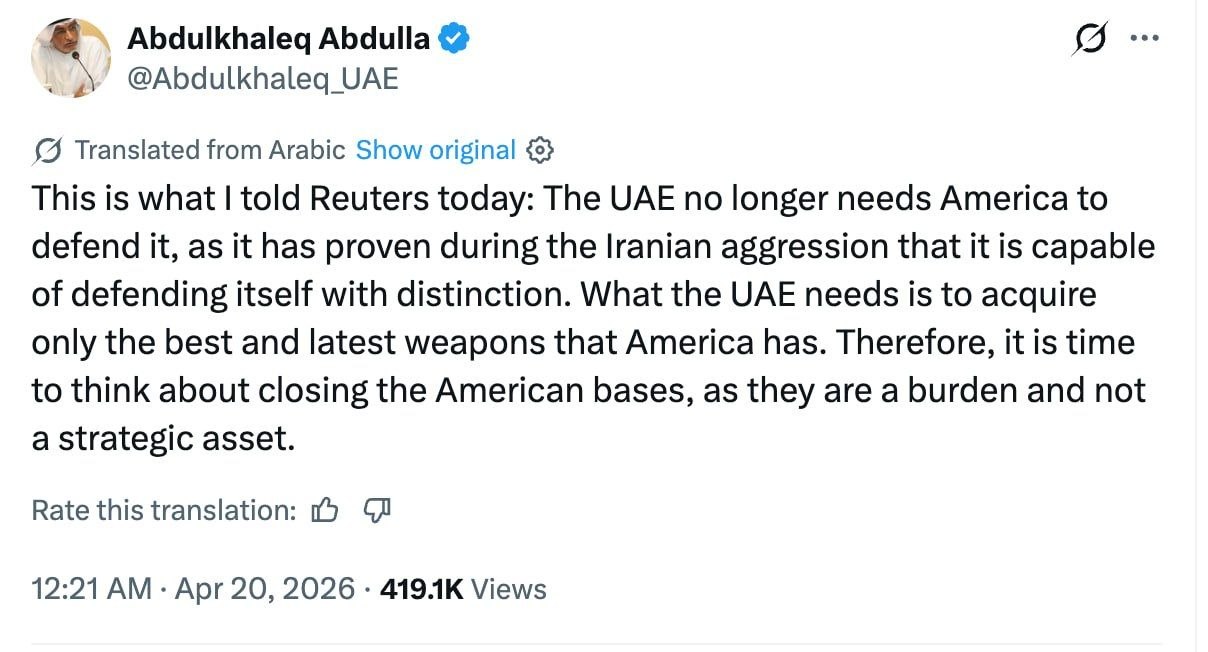 ОАЭ больше не нуждаются в защите Америки, поскольку во время иранской агрессии мы доказали, что способны достойно защитить себя. Что нужно ОАЭ, так это приобретать только самое лучшее и новейшее оружие, которое есть у Америки. Поэтому пришло время подумать о закрытии американских баз, поскольку они являются обузой, а не стратегическим активом.