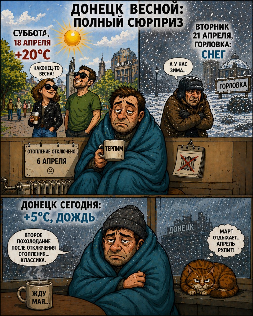 Стал свидетелем беседы двух дончанок с очевидно приезжим, который не совсем вкуривает, что тут происходит.- Понимаете, у нас же теперь ничего не показывают. Что-то взрывается, я слышу жужжание по вечерам, автоматные очереди, а потом тишина.- А потом...