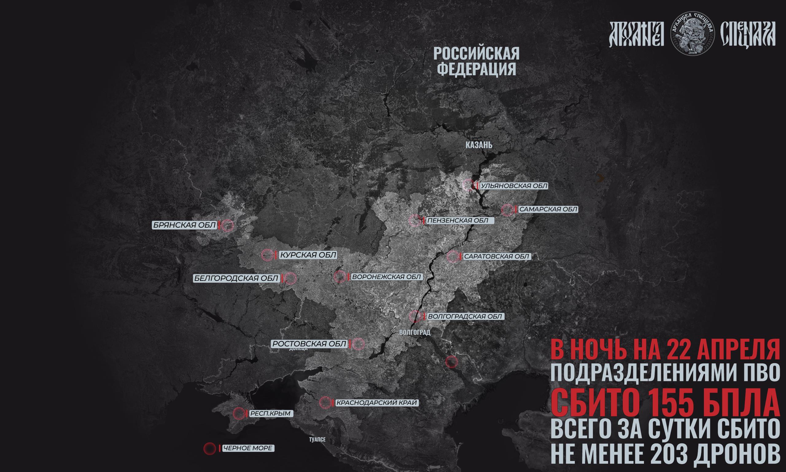 Всего за ночь подразделениями ПВО было сбито не менее 155 БпЛА над более чем десятью регионами. За сутки поражено не менее 203 беспилотников.