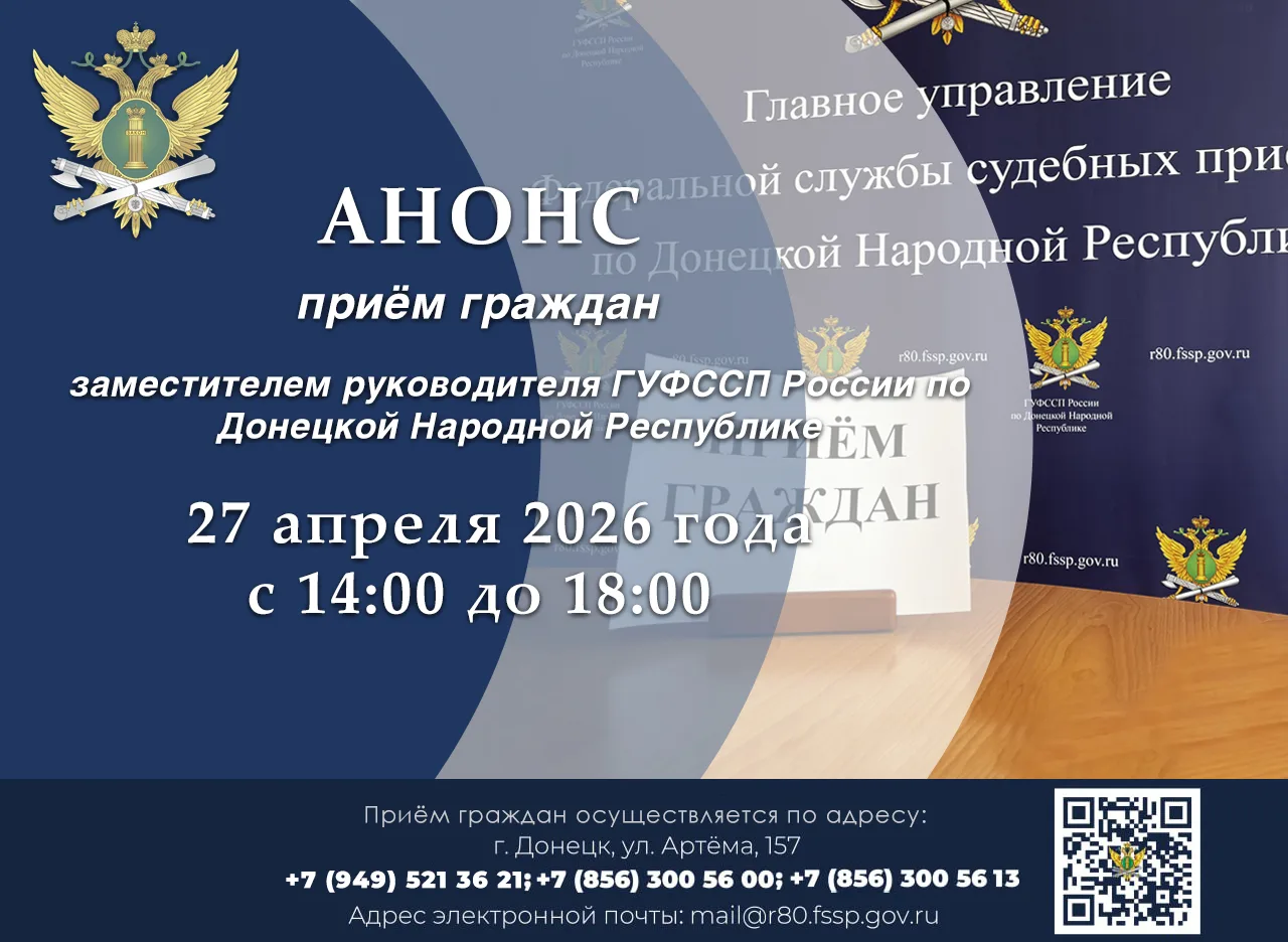 Заместителем руководителя Главного управления Федеральной службы судебных приставов по Донецкой Народной Республике – заместителем главного судебного пристава Донецкой Народной Республики осуществляется приём граждан по вопросам деятельности органов дознания и обеспечения установленного порядка деятельности судов.