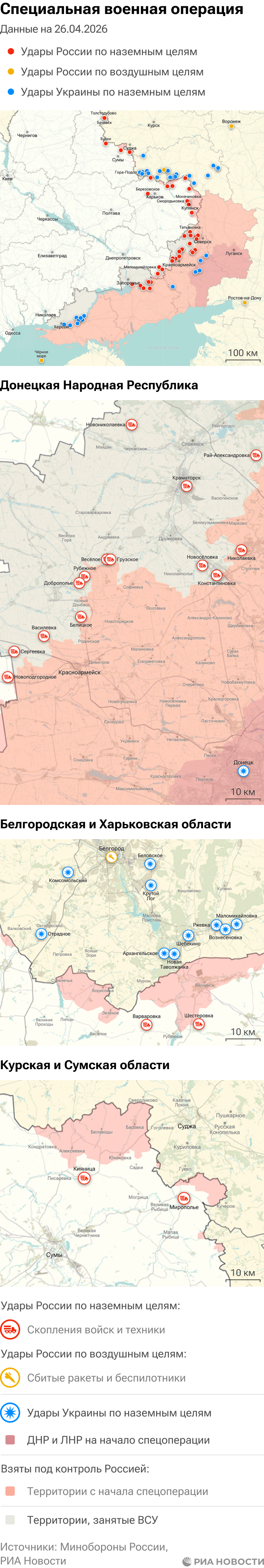 Российская армия с 24 февраля 2022 года проводит на Украине специальную военную операцию. Ее главной целью является помощь Донецкой и Луганской народным республикам, на территории которых с 2014 года не прекращались обстрелы. Перед российскими военными поставлена задача минимизировать потери личного состава и мирного населения при выполнении боевых заданий.Данные Минобороны и администраций новых регионов на 26 апреля 2026 года