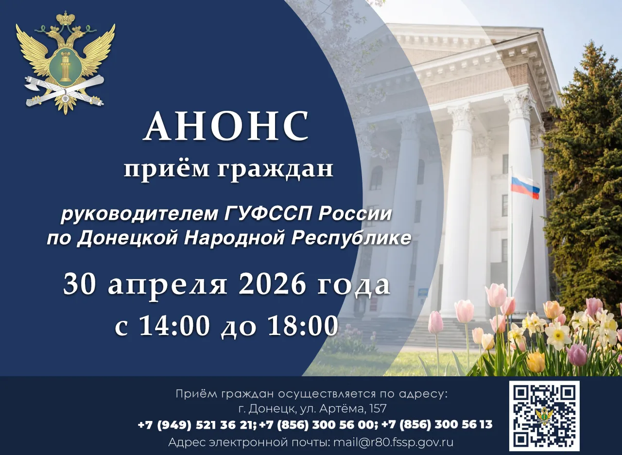 Руководителем Главного управления Федеральной службы судебных приставов по Донецкой Народной Республике — главным судебным приставом Донецкой Народной Республики осуществляется приём граждан по вопросам взыскания алиментов и иным категориям исполнительных производств, находящимся на исполнении в отделениях судебных приставов.